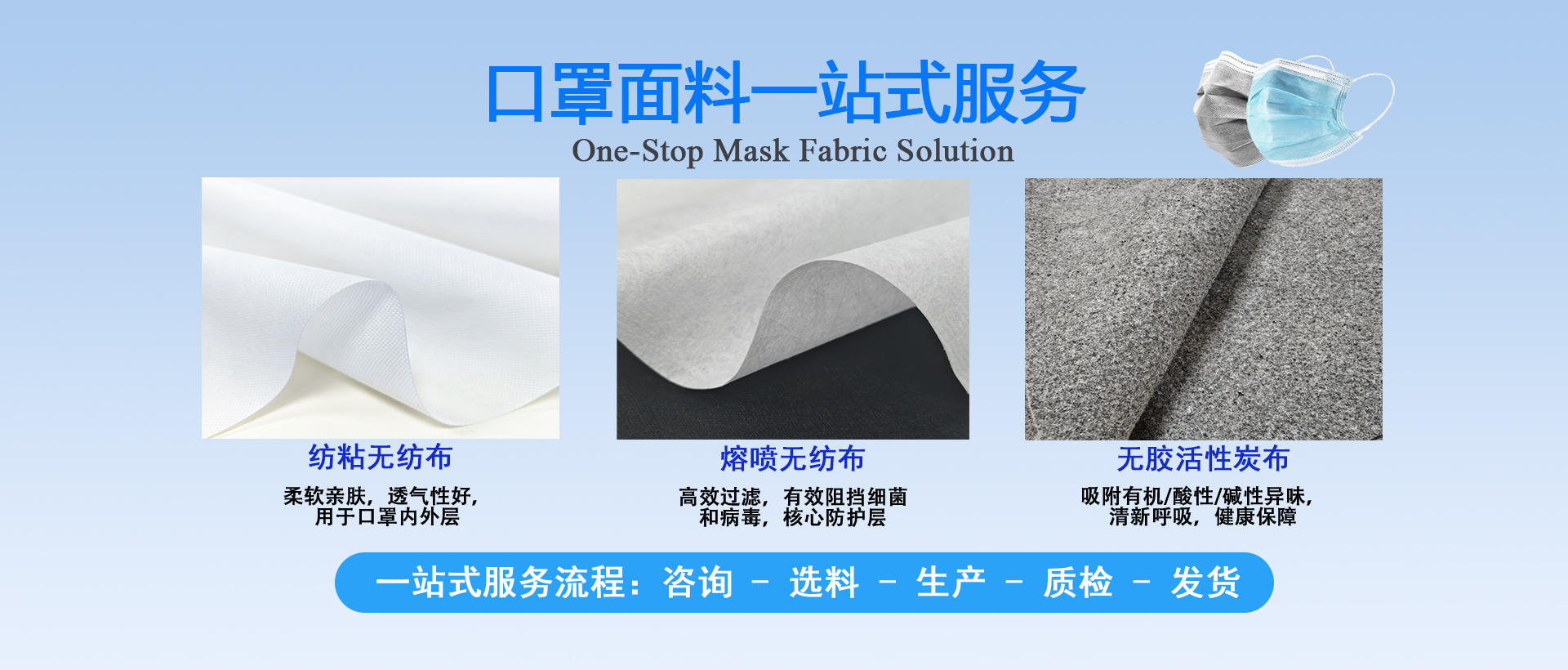 拥有10万级净化车间，500平方米研究生实验室，纺粘无纺布和水驻极熔喷布生产线；年产布料10000吨
